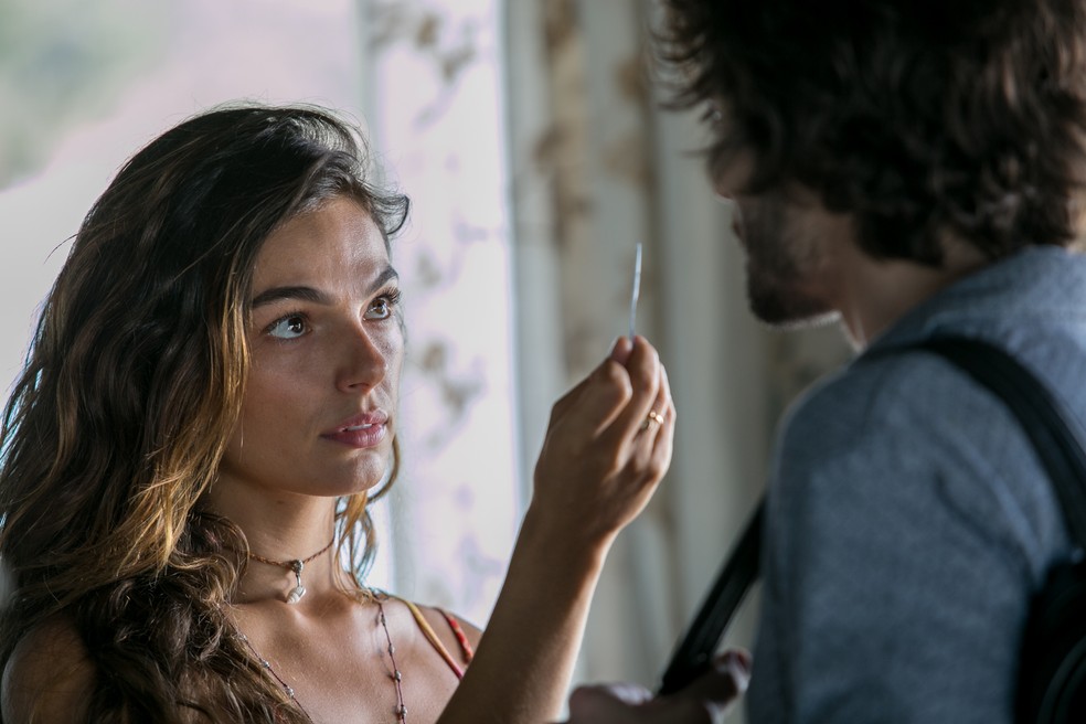 Rita mostra para Ruy o exame de gravidez com resultado positivo (Foto: Fábio Rocha / Gshow)