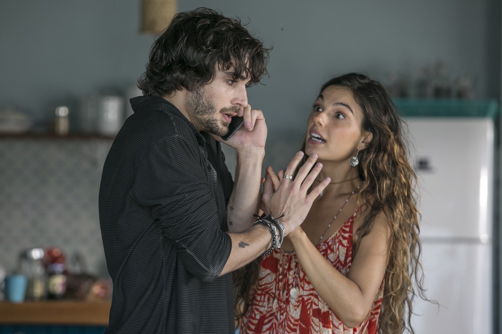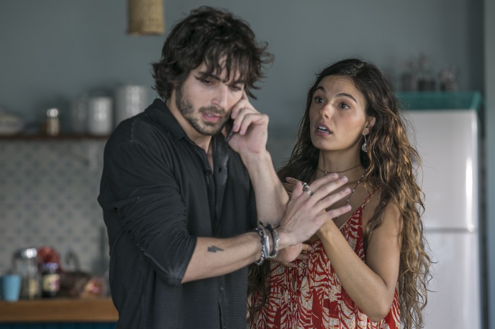 Ruy recebe uma ligação lá de Parazinho, e Rita está aflita querendo saber quem é (Foto: Fábio Rocha / Gshow)