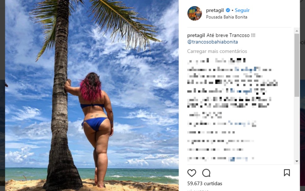 Após maratona no carnaval de Salvador, a cantora Preta Gil se despediu da Bahia com uma foto na praia de Trancoso, distrito de Porto Seguro, no sul da Bahia, neste sábado (17).