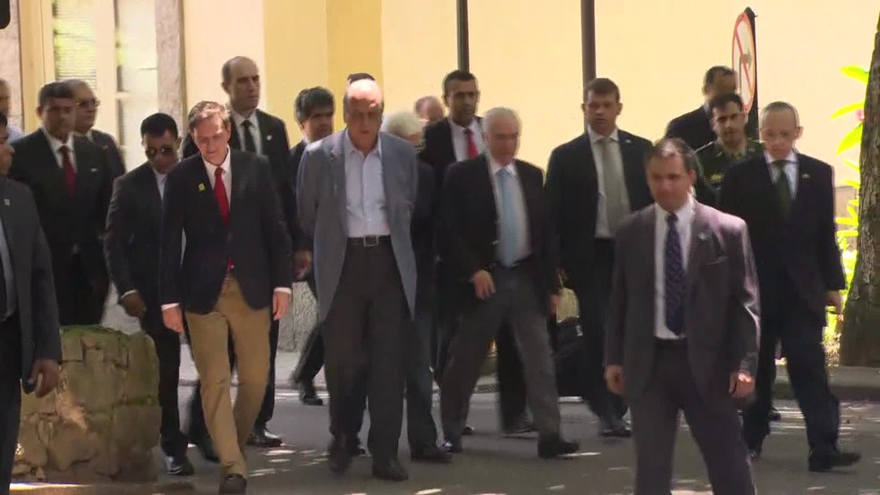 O prefeito Marcelo Crivella, o governador Luiz Fernando Pezão e o presidente Michel Temer em reunião na manhã deste sábado (Foto: Reprodução/ TV Globo)