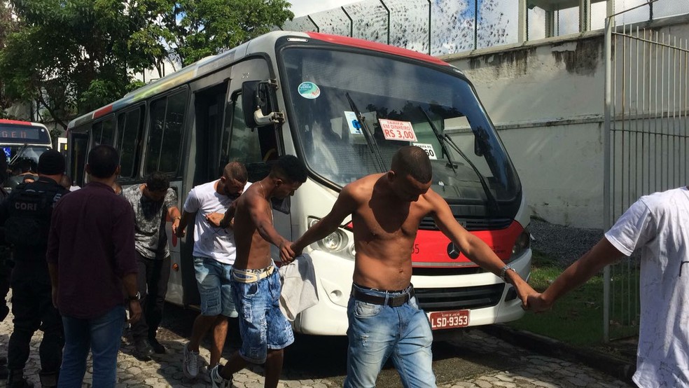 Suspeitos tiveram que ser levados para a Cidade da Polícia de ônibus (Foto: Fernanda Rouvenat / G1)