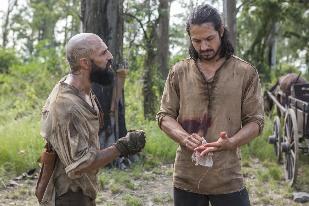 Após ganharem uma vantagem na fuga dos guardas, o grupo faz uma parada dar água aos cavelos e Afonso examina Cássio (Foto: Artur Meninea/Gshow)